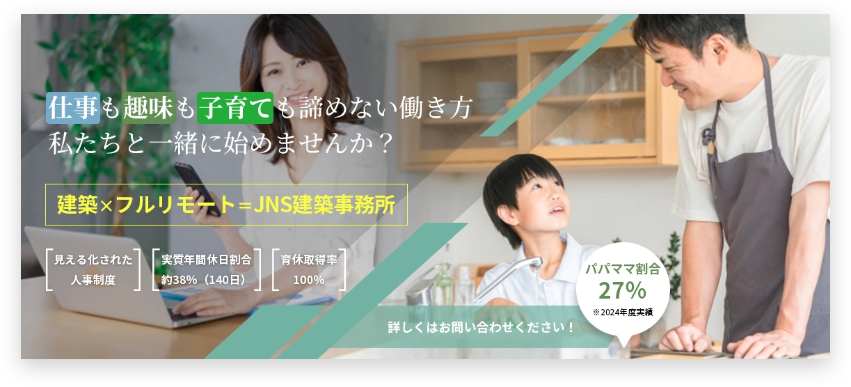 社員の働き方には高い自由度があり、安心して長く働ける職場環境が整っています。多様なバックグラウンドを持つ人材が活躍することで、社内には新しい発想が生まれ、サービスの改善と革新が継続的に進められています。「建築 × フルリモート」の実現も、JNSならではの特長です。