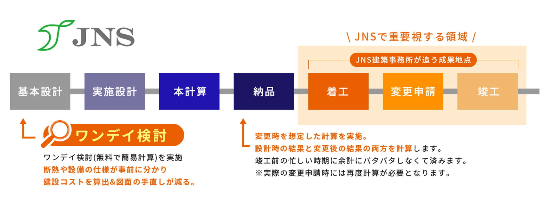 JNS建築事務所では断熱仕様や設備条件を事前に確認しながら進める簡易計算「ワンデイ検討」サービスを提供。